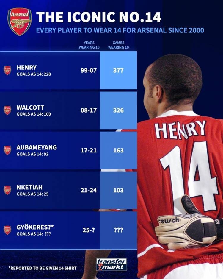 直播吧7月25日讯 多方消息确认,约克雷斯将转会阿森纳,他还将接手传奇的14号球衣。《转会市场》也列出了阿森纳14号在新世纪的主人: